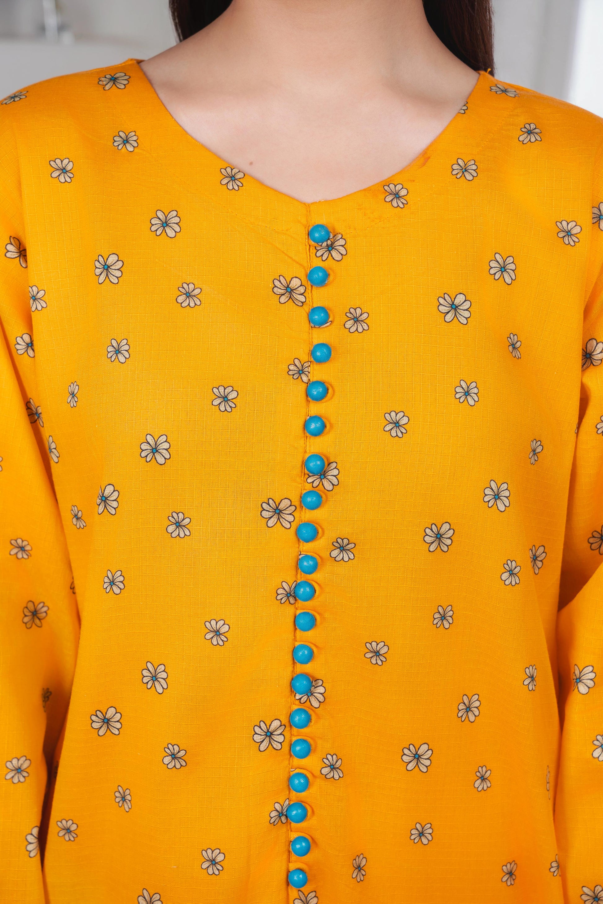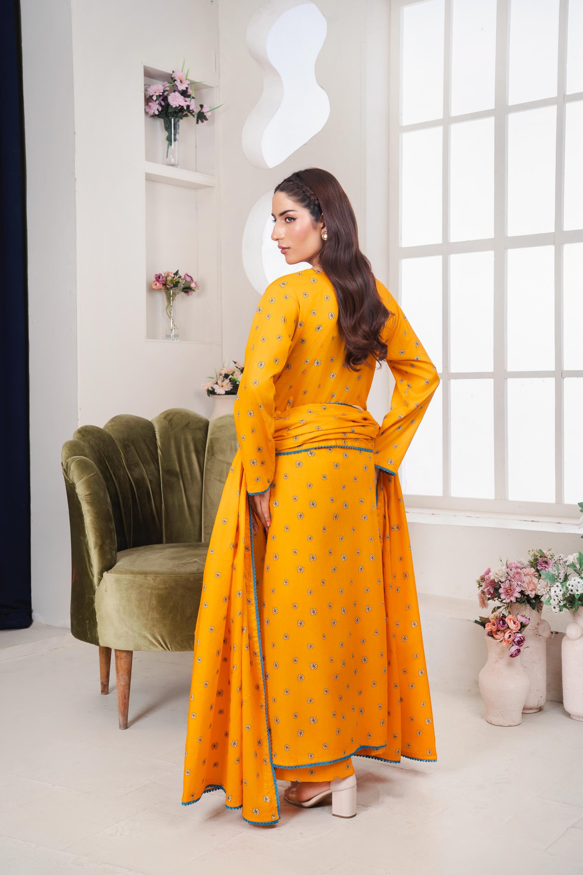 Elevate your wardrobe with this stunning yellow 3-piece lawn suit, featuring delicate allover digital print and intricate detailing. Designed for comfort and elegance, this ensemble includes: