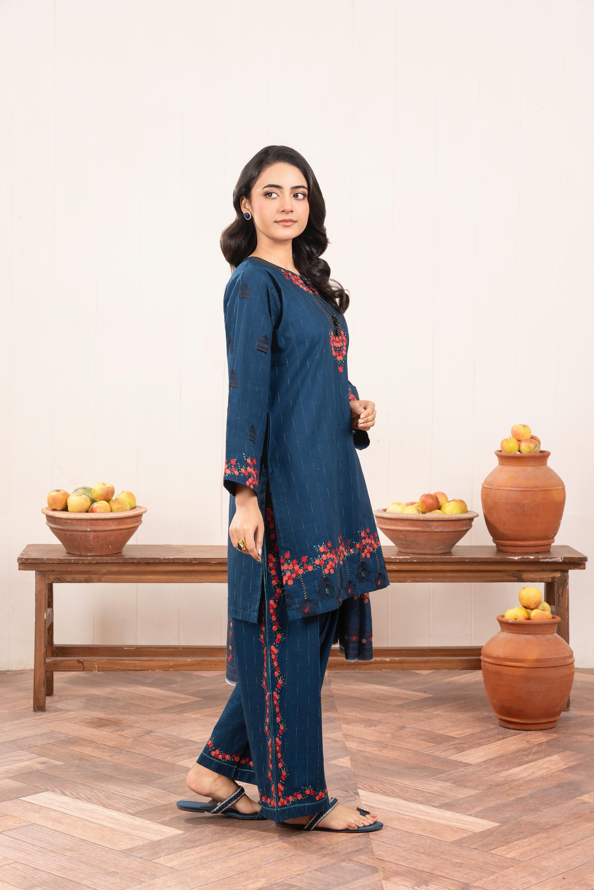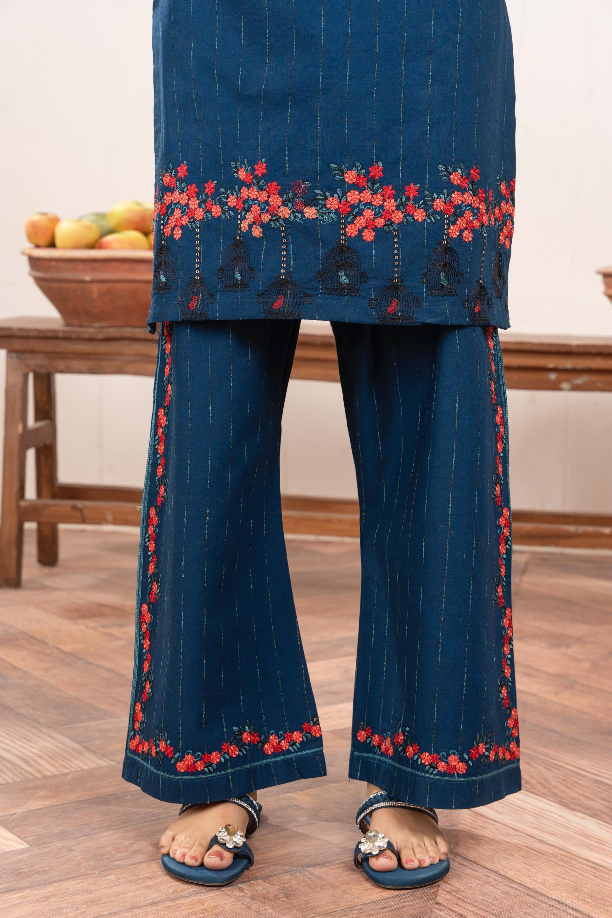 Turn heads with this Navy Blue Embroidered 3-Piece Suit, featuring a sophisticated combination of rich hues and striking embroidery. The shirt is beautifully decorated with vibrant red floral embroidery on the neckline and sleeves, highlighted by subtle gold pinstripes for an elegant contrast. The straight trousers complement the shirt’s design, while the printed dupatta adds a modern touch with its colorful borders and floral details.