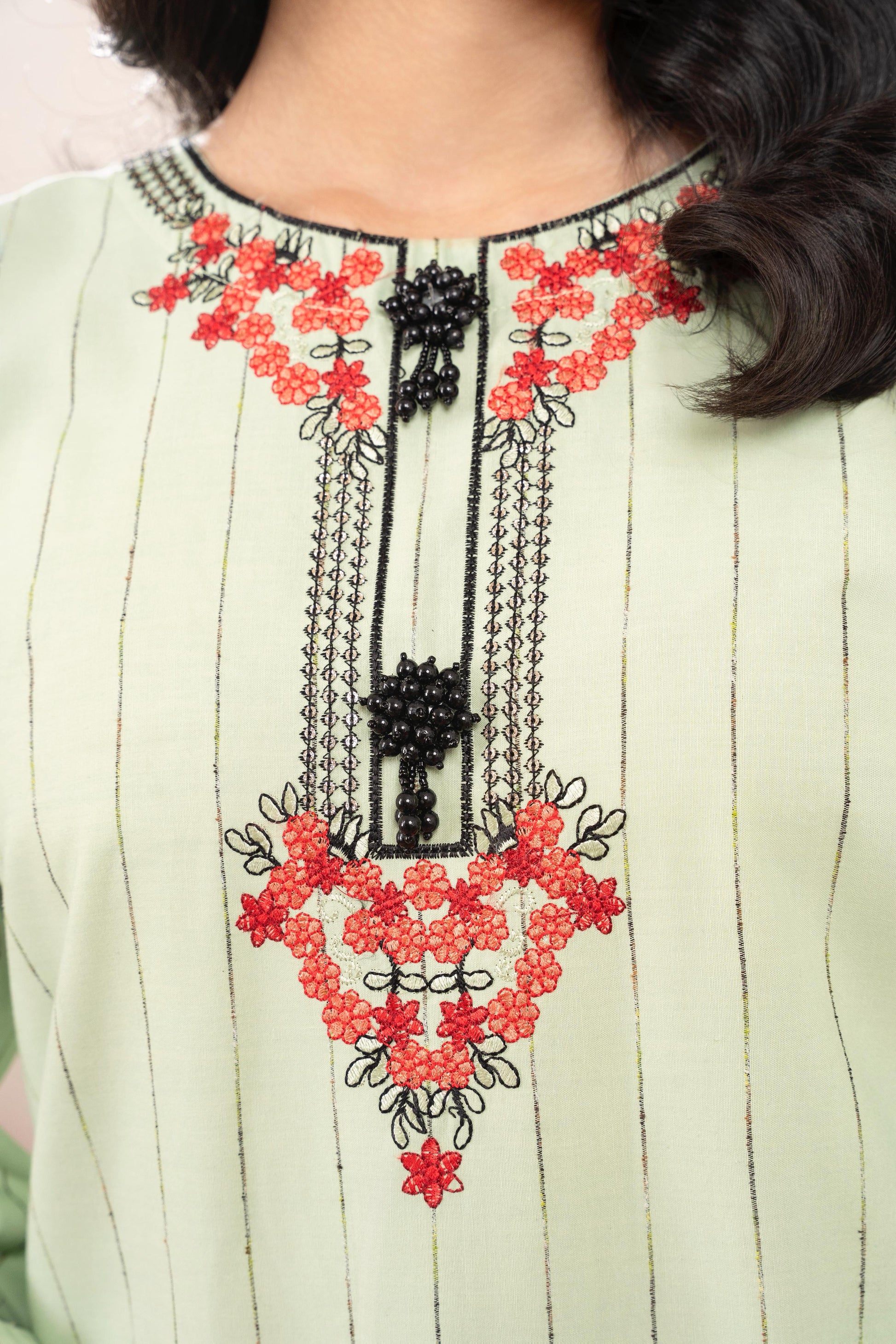 Elevate your wardrobe with this elegant Pastel Green Embroidered 3-Piece Suit, crafted for timeless grace and everyday sophistication. The soft lawn fabric features intricate embroidery on the neckline, hem, and sleeves, complemented by delicate floral patterns that add a vibrant charm. The matching straight trousers carry subtle printed detailing for a cohesive look, while the beautifully designed printed dupatta enhances the ensemble with its bold borders and traditional motifs.